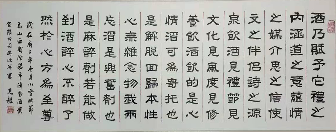 汾陽市清香酒業(yè)有限公司座落在中華名酒第一村---杏花村申明亭路9號。《汾酒曲》中記載,申明亭畔新淘井,水重依稀亞蟹黃 ,注解說:申明亭井水絕佳,以之釀酒,斤兩獨重。明末愛國詩人、書法家和醫(yī)學家傅山先生,曾為申明亭古井親筆題寫了得造花香四個大字,說明杏花井泉得天獨厚,釀出的美酒如同花香沁人心脾。 汾陽市清香酒業(yè)有限公司出品的清香型高端白酒用的是優(yōu)質高粱、大麥和豌豆等上等原料和申明亭地下礦泉水,再加上杏花村土壤和空氣中獨有的菌群,在杏花村釀酒匠人的傳統工藝下精心釀造:清蒸二次清,固態(tài)地缸分離發(fā)酵,清字當頭,一清到底,釀出的酒:酒液晶亮、清香幽雅、醇凈柔和、回甜爽口、飲后余香,在國內外享有盛譽。